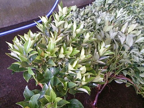 暑い日が続きます 久々の日記です。 毎日、切り枝の出荷と畑の手入れに追われてます。 いよいよ、新芽も固まり始めました。とは言っても、生産者の方が一手間掛けて、新芽を短く止めてくれました。多くの本数は出来ませんが、出荷しているうちに通常の根付きも固まります! 今日は、切り枝と切り洗いを同時にやってます。忙しい方が、暇な時よりつかれませんね!